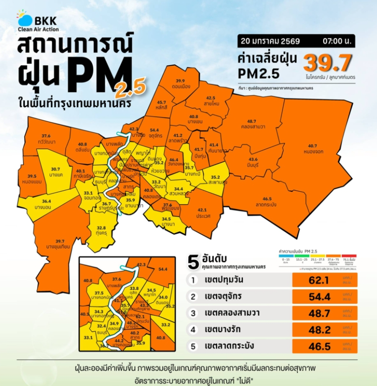 เช้าวันนี้หลายคนตื่นมาพร้อมหมอกบางๆ ที่ไม่ได้มาจากอากาศเย็น แต่เป็นฝุ่น PM2.5 โดยข้อมูลล่าสุดเมื่อเวลา 07.00 น. วันที่ 20 มกราคม 2569 ระบุว่าค่าเฉลี่ยฝุ่น PM2.5 ของกรุงเทพมหานครอยู่ที่ 39.7 ไมโครกรัมต่อลูกบาศก์เมตร สูงกว่าค่ามาตรฐานที่กำหนดไว้ 37.5 มคก./ลบ.ม. ส่งผลให้ภาพรวมคุณภาพอากาศอยู่ในระดับสีส้ม หรือ “เริ่มมีผลกระทบต่อสุขภาพ” และยังมีแนวโน้มเพิ่มขึ้นอย่างต่อเนื่อง