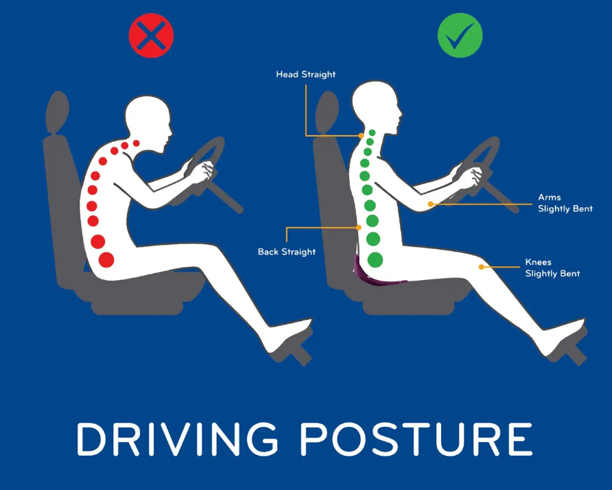 ท่าทางที่เหมาะสมคือ นั่งให้หลังแนบพนัก เบาะไม่ต่ำหรือสูงเกินไป แขนงอเล็กน้อยเมื่อจับพวงมาลัย และขาสามารถกดเบรกได้เต็มแรงโดยไม่ต้องเหยียดสุด วิธีนี้จะช่วยลดอาการปวดหลังเมื่อขับรถทางไกล และช่วยให้คุณยังตื่นตัวแม้ต้องเผชิญรถติดยาวๆ เหมาะมากกับคนที่เลือกรถเช่าระยะยาว หรือ เช่ารถระยะยาว ใช้ขับทำงานในเมืองทุกวัน